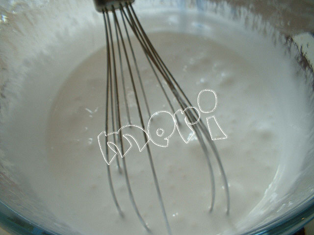 Poner en otro bol la clara, con varilla eléctrica batir un poco e ir añadiendo el almíbar a hilo.